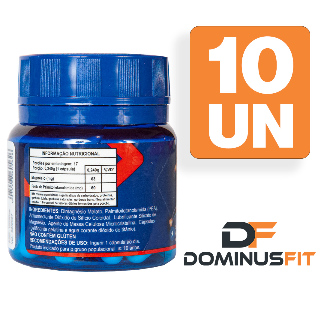 Ingredientes: Dimagnésio Malato, Palmitoiletanolamida (PEA). Antiumectante Dióxido de Silício Coloidal. Lubrificante Silicato de Magnésio. Agente de Massa Celulose Microcristalina. Cápsulas (gelificante gelatina e água; corante dióxido de titânio).