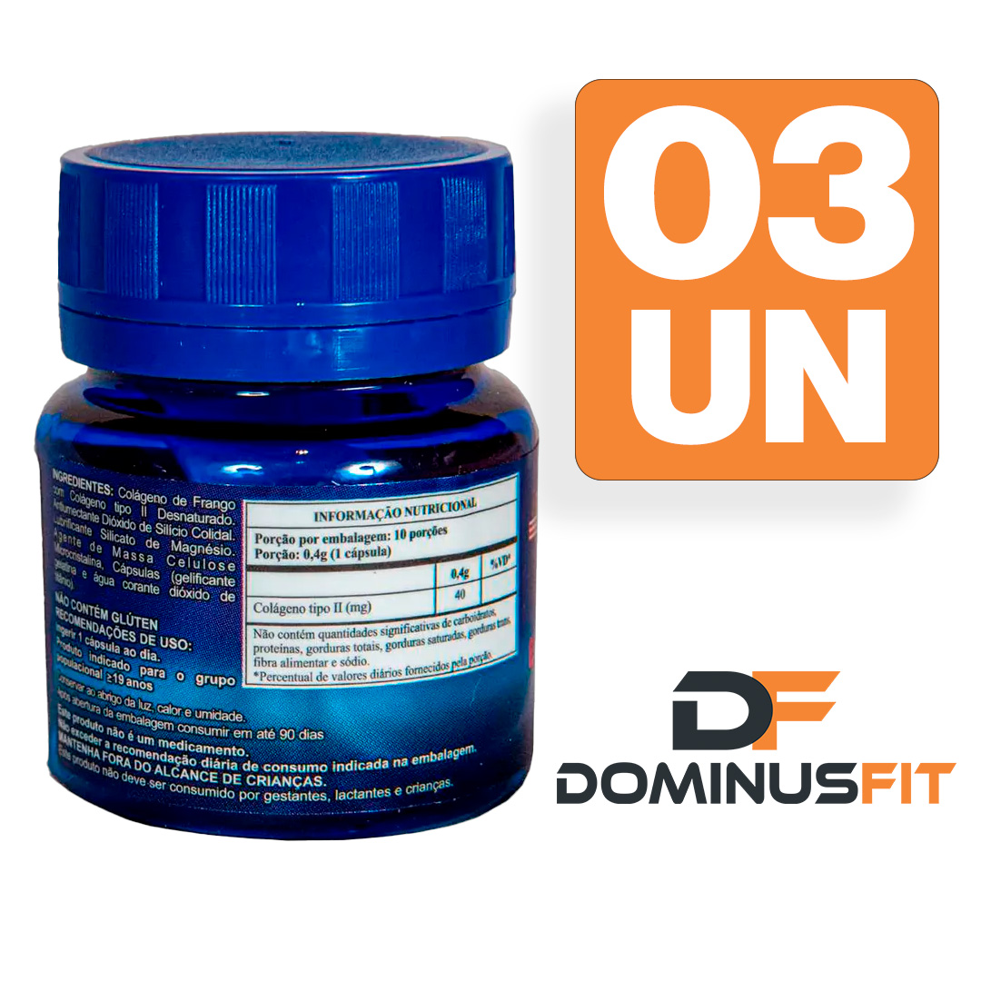 Ingredientes: Colágeno Tipo 2, excipientes (composição da cápsula). Não contém glúten.