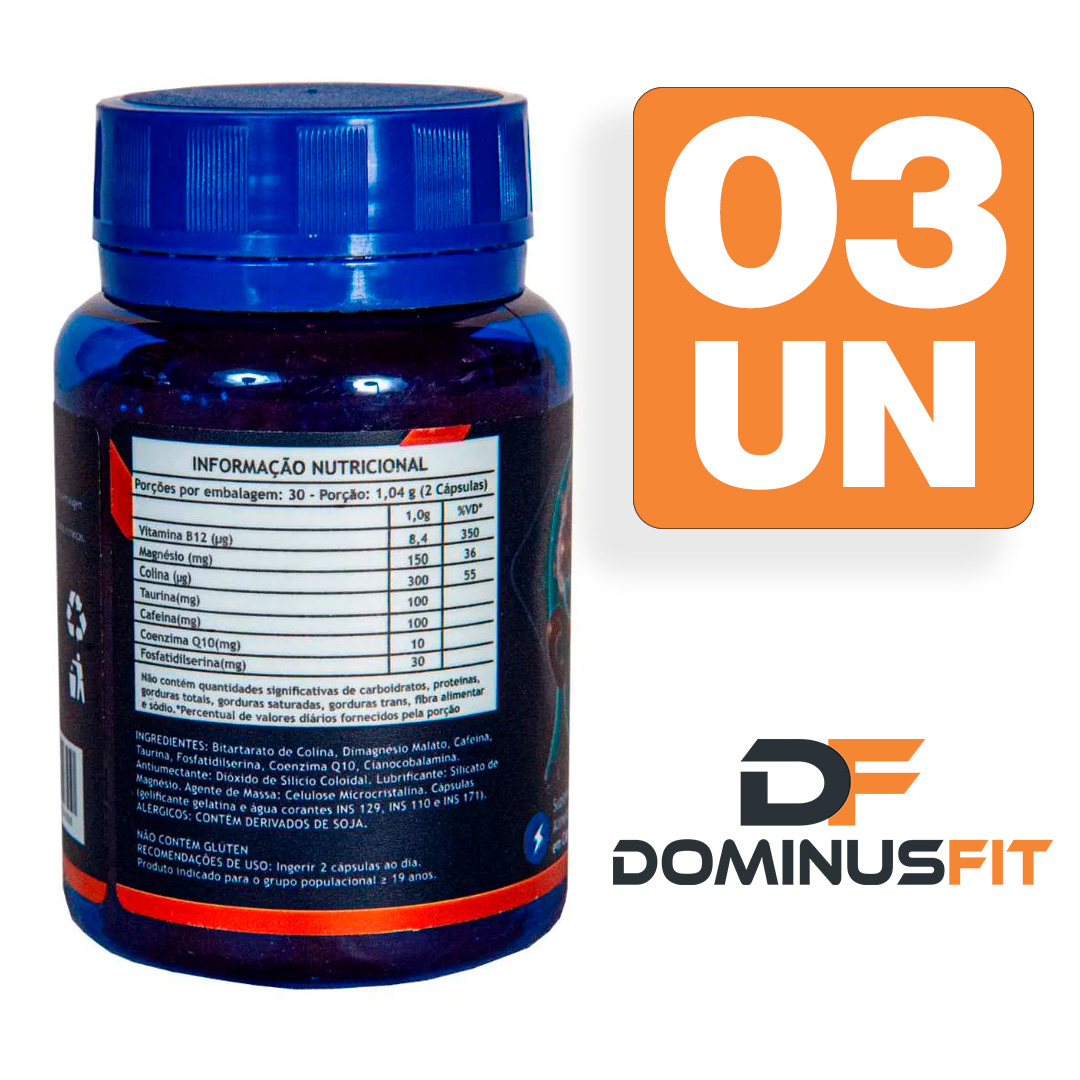Ingredientes: Bitartarato de Colina, Dimagnésio Malato, Cafeína, Taurina, Fosfatidilserina, Coenzima Q10, Cianocobalamina. Antiumectante: Dióxido de Silício Coloidal. Lubrificante: Silicato de Magnésio. Agente de Massa: Celulose Microcristalina. Cápsula: gelatina, água, corantes INS 129, INS 110 e INS 171. ALÉRGICOS: Contém derivados de soja. Não contém glúten.