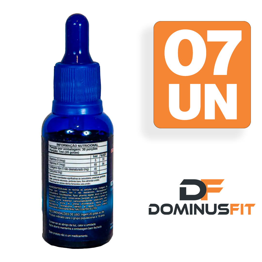 Ingredientes: Cúrcuma, Colágeno Tipo 2, Vitamina K, Vitamina D, Excipientes (base da fórmula). Não contém glúten.