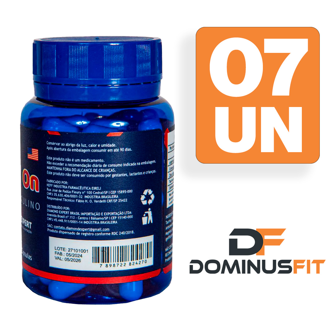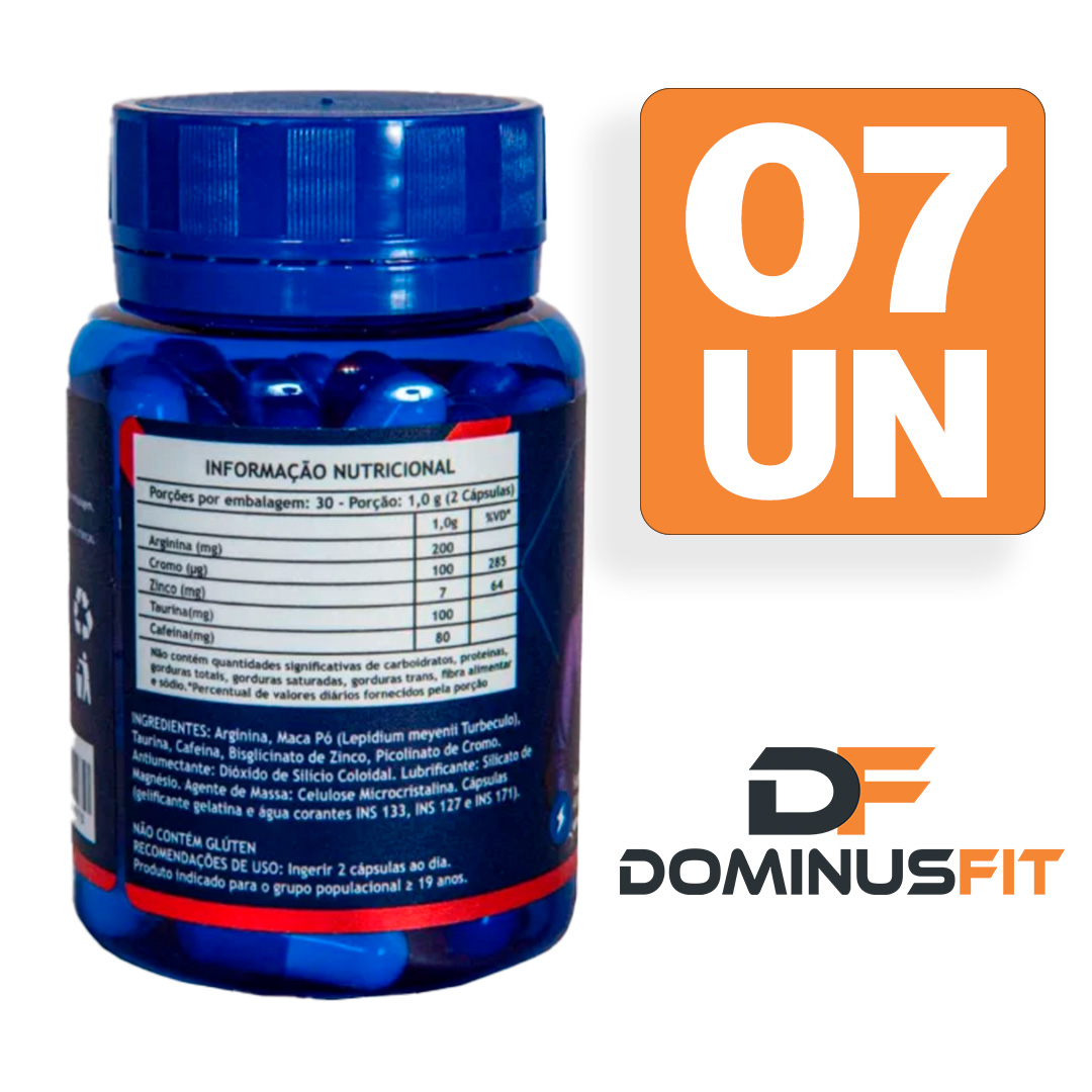 Ingredientes: Arginina, Maca Pó (Lepidium meyenii Turbeculo), Taurina, Cafeína, Bisglicinato de Zinco, Picolinato de Cromo. Antiumectante: Dióxido de Silício Coloidal. Lubrificante: Silicato de Magnésio. Agente de Massa: Celulose Microcristalina. Cápsulas (gelatina, água e corantes INS 133, INS 127 e INS 171). Não contém glúten.