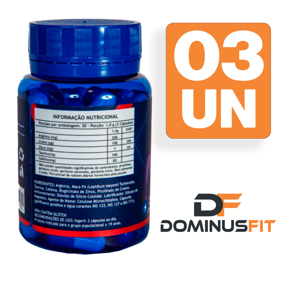 Ingredientes: Arginina, Maca Pó (Lepidium meyenii Turbeculo), Taurina, Cafeína, Bisglicinato de Zinco, Picolinato de Cromo. Antiumectante: Dióxido de Silício Coloidal. Lubrificante: Silicato de Magnésio. Agente de Massa: Celulose Microcristalina. Cápsulas (gelatina, água e corantes INS 133, INS 127 e INS 171). Não contém glúten.